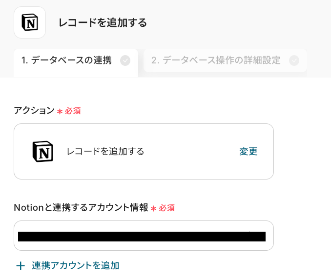 - 最後に、オペレーションでNotionの「レコードを追加する」アクションを設定し、取得した商品情報をNotionのデータベースに追加します。