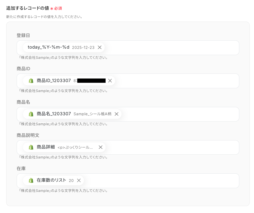 - Notionの「レコードを追加する」オペレーションでは、レコードを追加したいデータベースIDを指定し、どのプロパティにどの商品情報を登録するかを任意で設定してください。