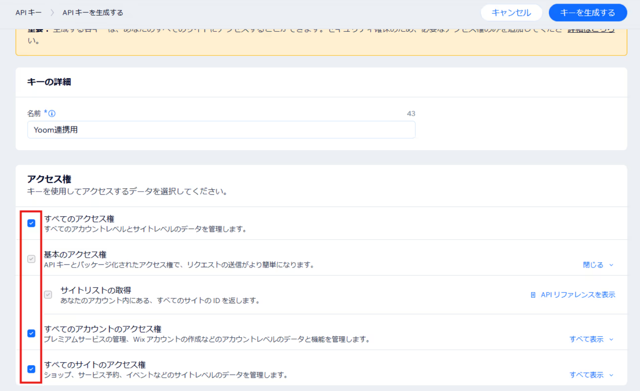 アクセス権は「すべてのアクセス権」を選択後、「キーを生成する」をクリックします。