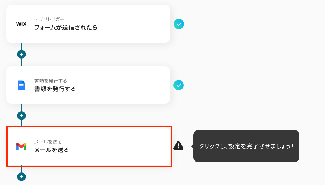 - Wixのトリガー設定、Googleドキュメントのアクション設定、Gmailのアクション設定