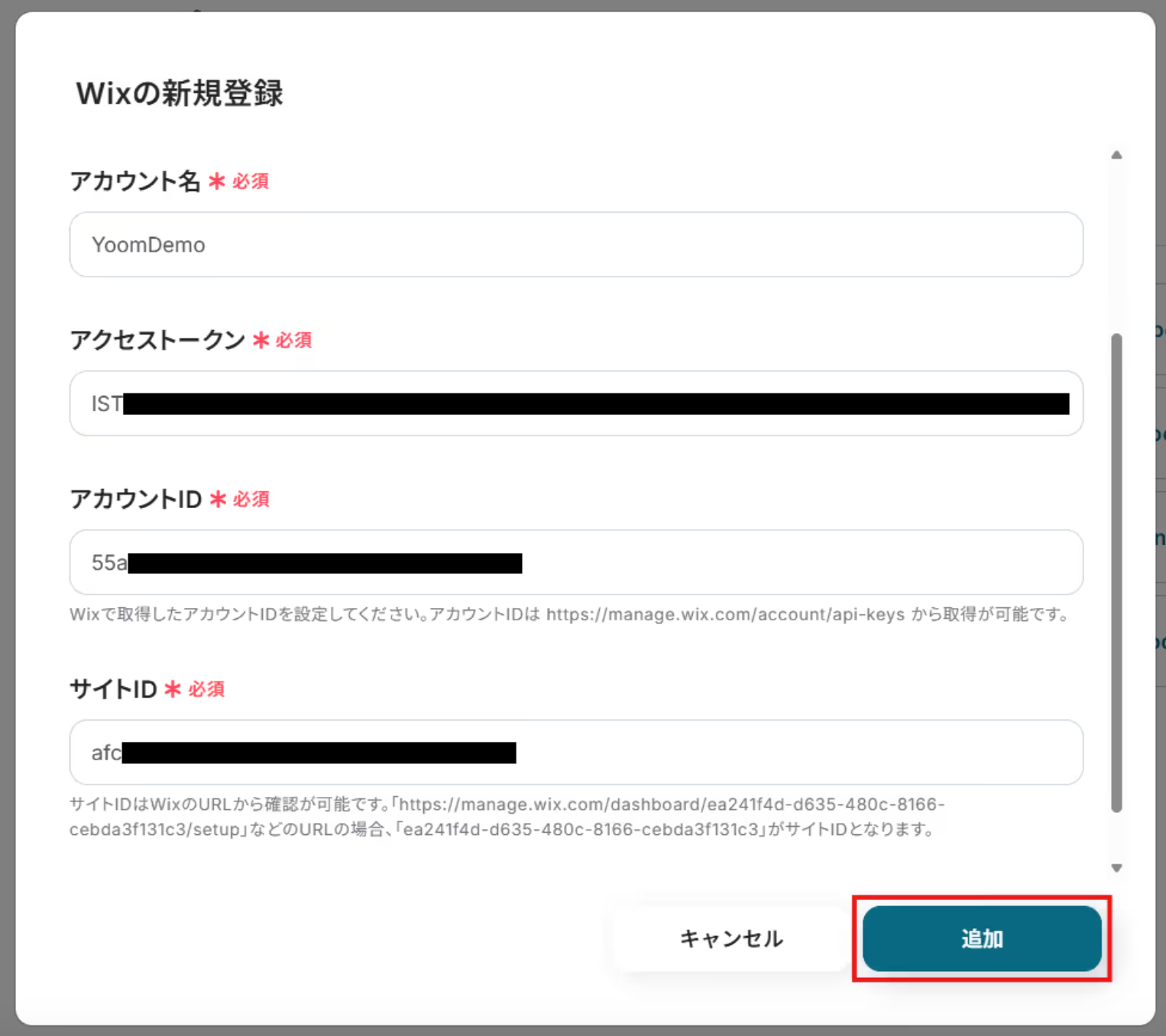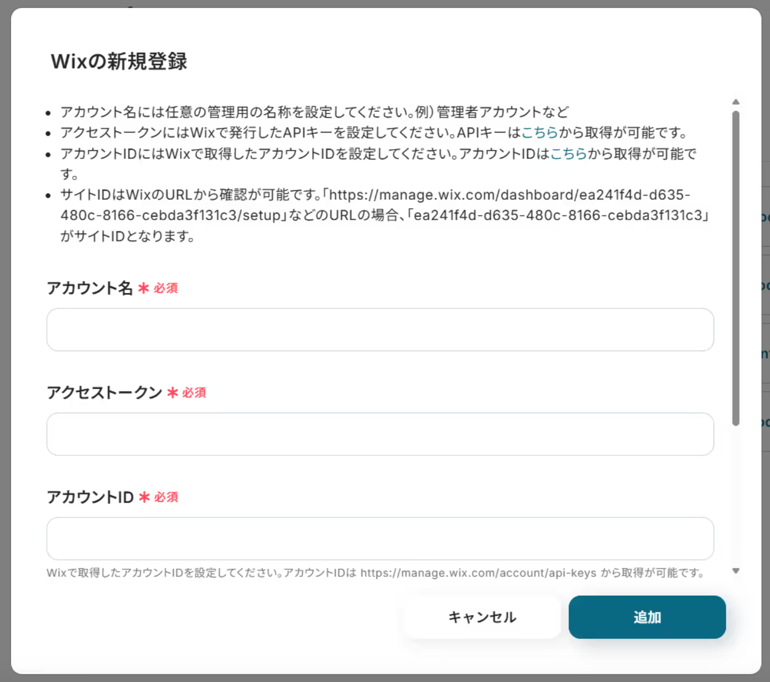 「サイトID」はWixのダッシュボードURLから取得できるIDを設定してください。
