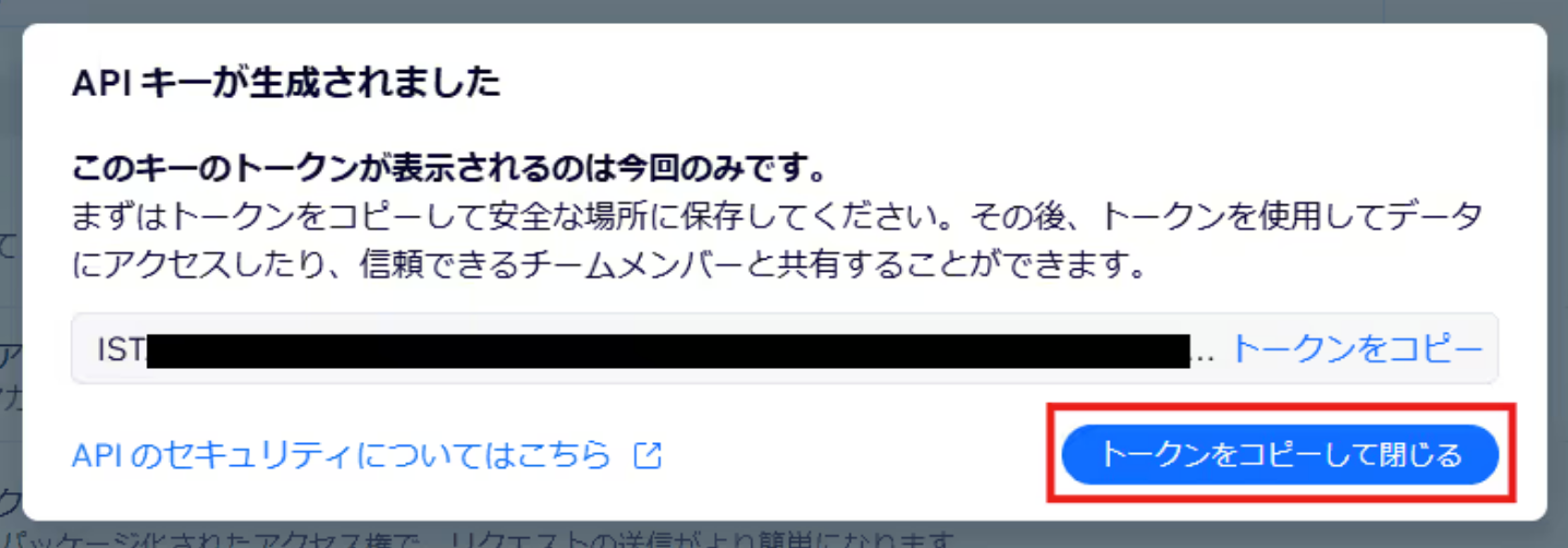 これ以降、トークンは確認できなくなってしまうため、コピーしたトークンを必ず保存してください。