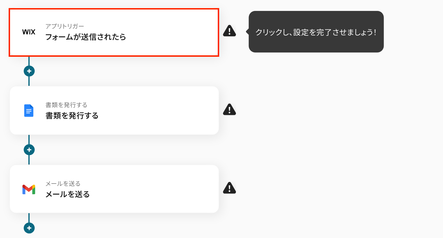 ここから「Wixでフォームが送信されたら、Googleドキュメントで書類を作成し担当者に送信する」フローの設定をしていきます。