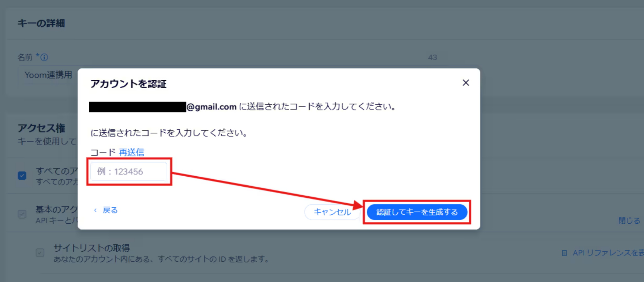 送信される認証コードを入力し、「認証してキーを生成する」をクリック。
