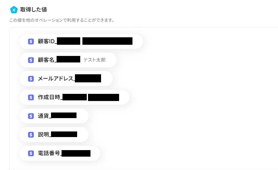 必要な項目の設定が終わったら「テスト」ボタンを押してみてください。成功していれば、取得した値にStripeで作成された顧客の情報が反映されています。