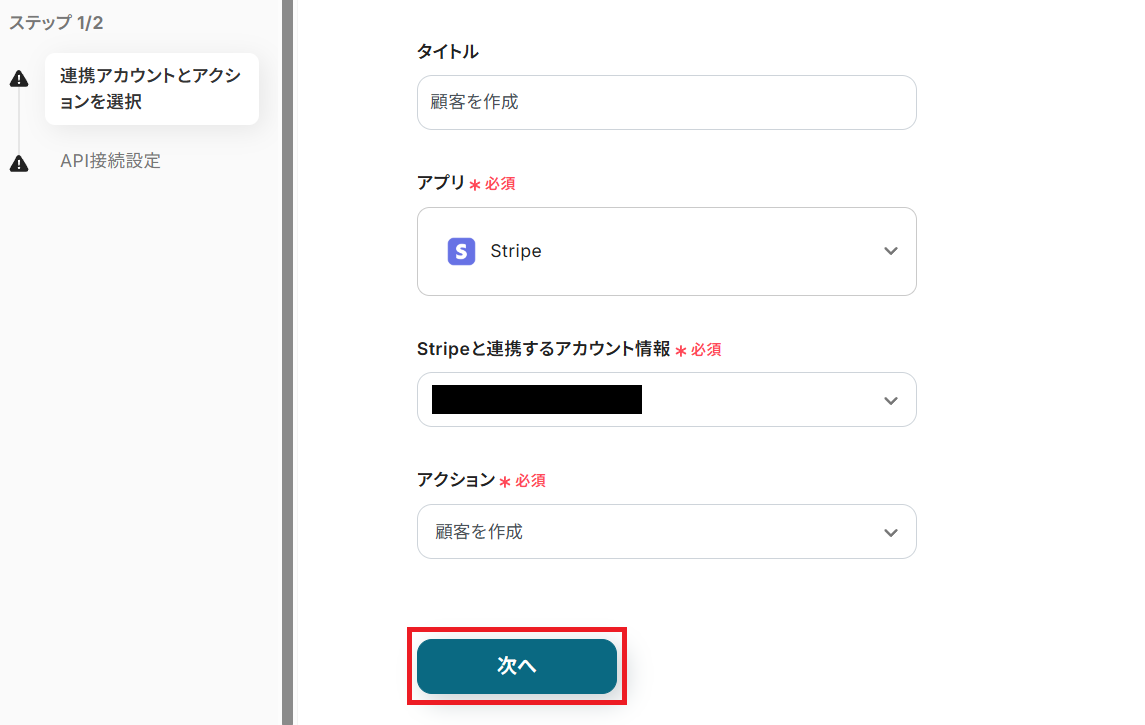 タイトルを任意で設定し、Stripeと連携するアカウントやアクション内容を確認したら「次へ」を押してください。