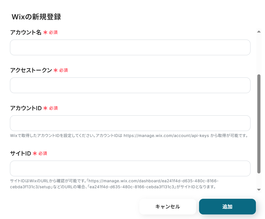 Wixの連携画面では、以下4つの情報を設定しましょう。