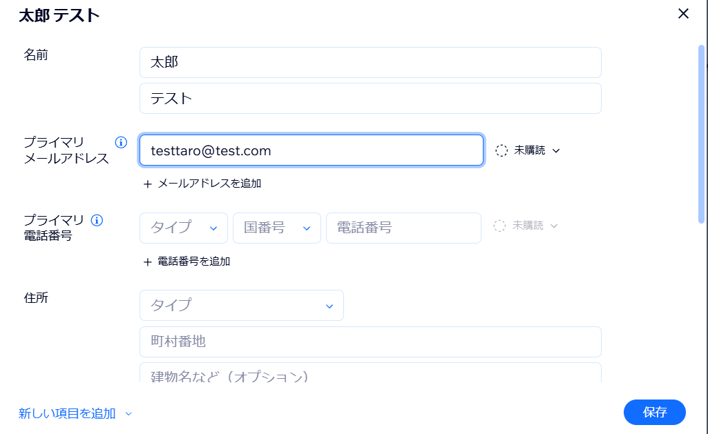 WebhookURLをWix側にペーストできたら、そのままテスト用に連絡先を追加しましょう。