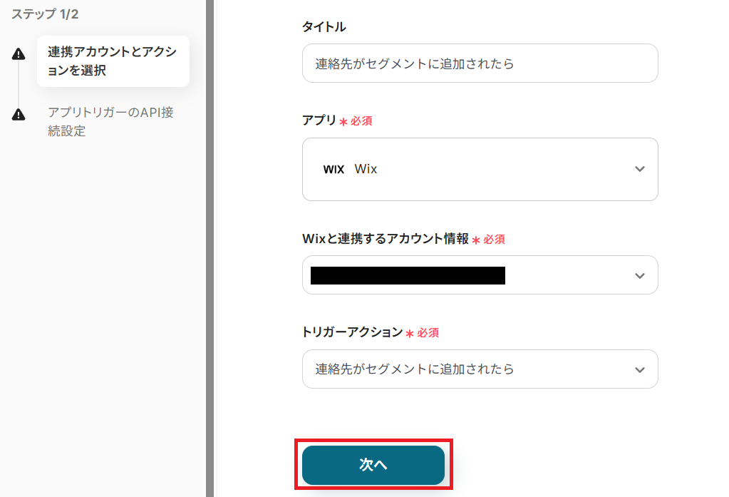 タイトルを任意で設定し、Wixと連携するアカウントやアクション内容を確認したら「次へ」を押してください。