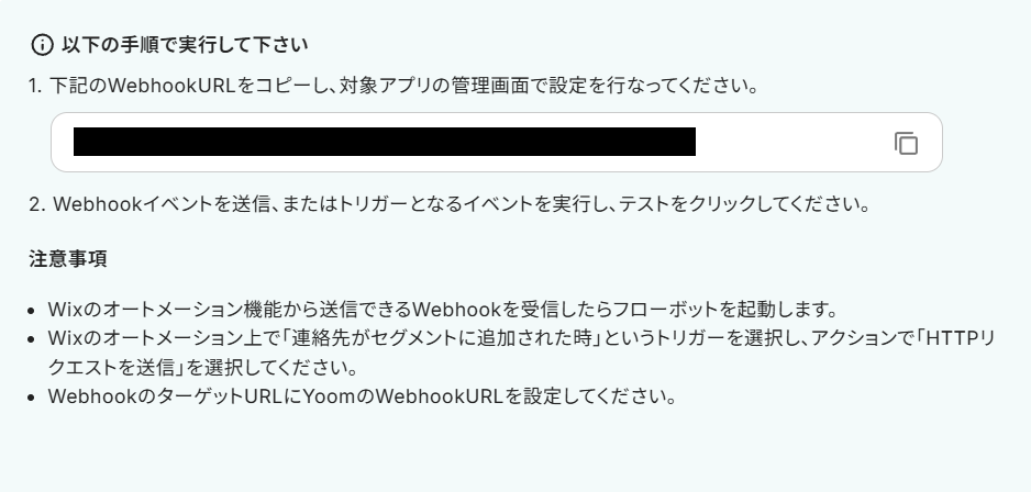 Yoomの画面からWebhookURLをコピーし、Wixの管理画面にペーストしましょう。