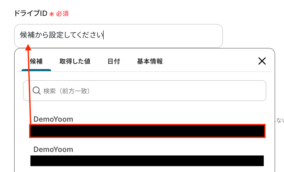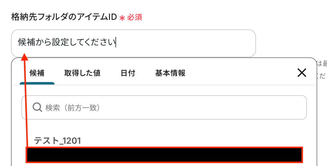 入力欄をクリックすると連携が有効になっているアカウントから候補が表示されるので、対象の項目を選択しましょう。