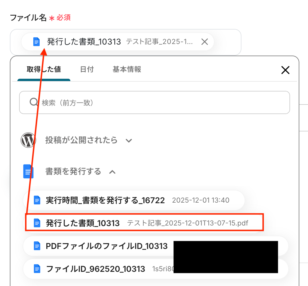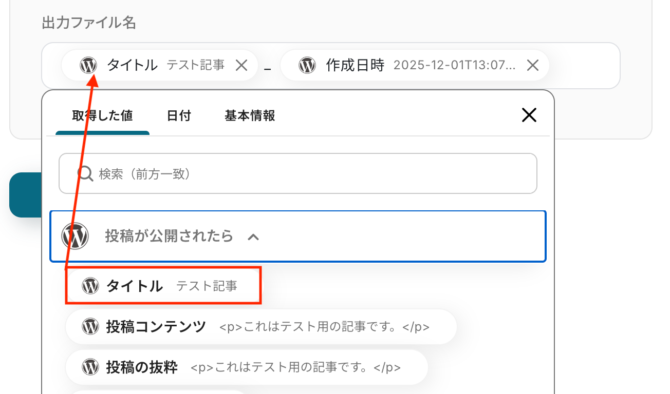 - ファイル名には、WordPress.orgのトリガーで取得した記事タイトルや公開日といった情報を変数として設定できます。これにより、ファイルが整理され管理しやすくなります。