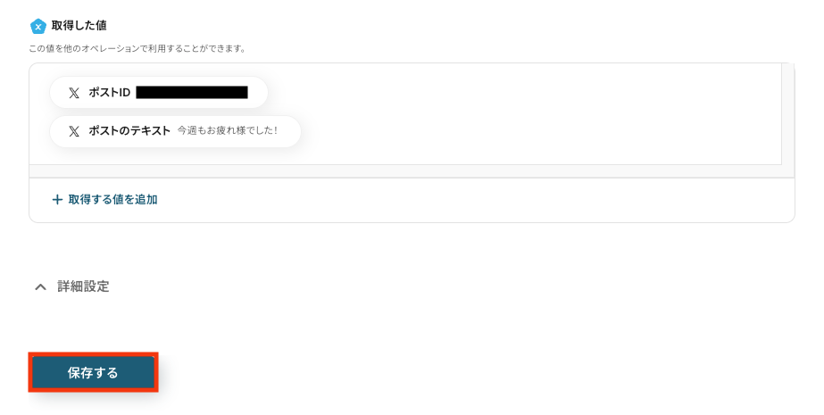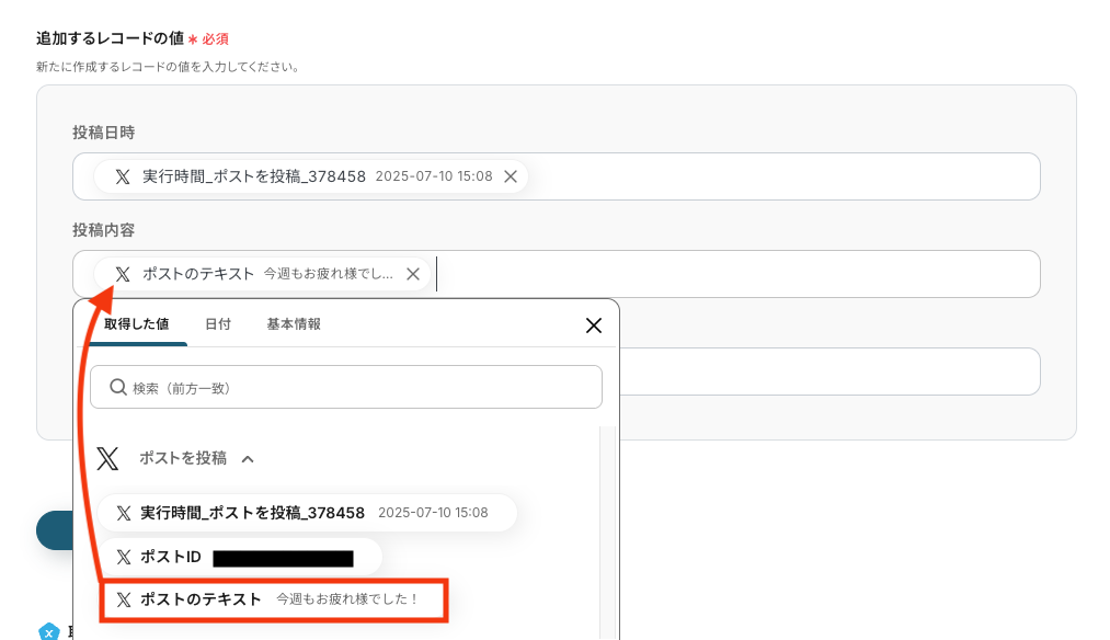 各項目に、前段でX(Twitter)から取得したデータを割り当てて設定します、
