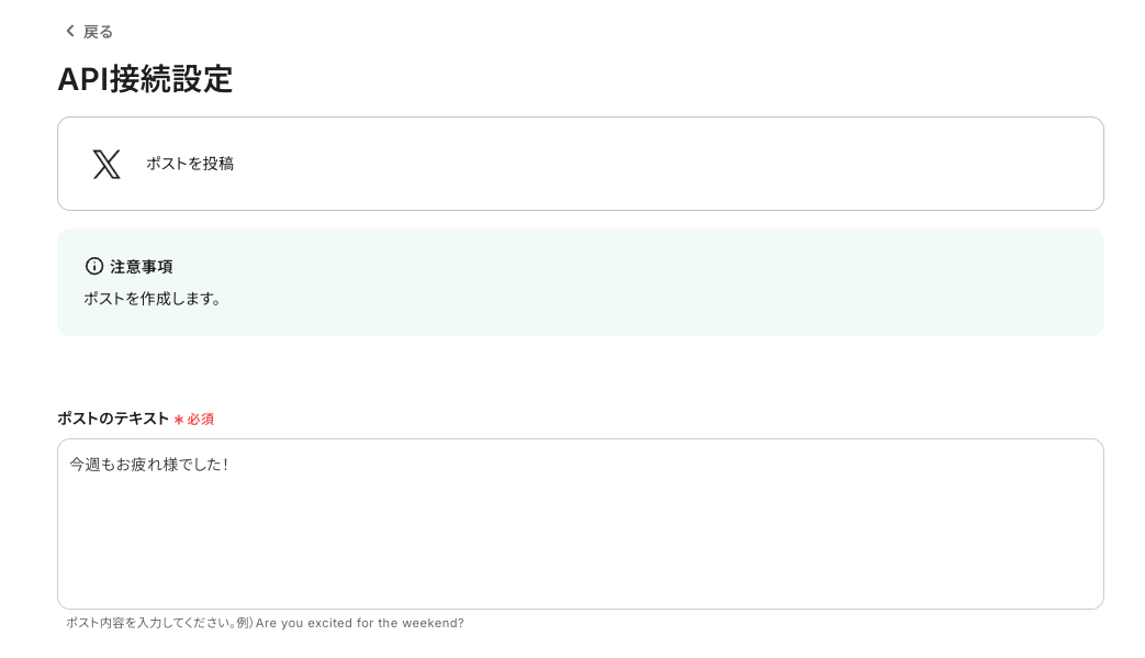 X(Twitter)に投稿したいテキスト内容を任意で入力します。