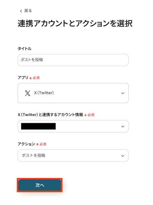 X(Twitter)と連携するアカウント情報に問題がなければ、「次へ」をクリックします。