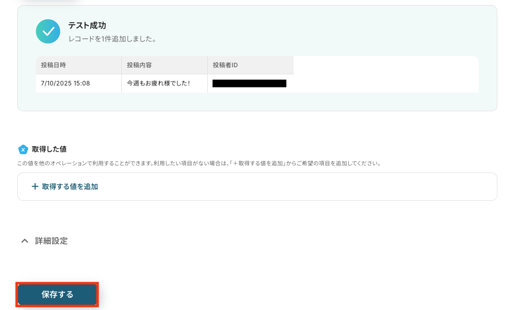 Yoomの操作画面に戻り、取得した値を確認し、「保存する」をクリックします。