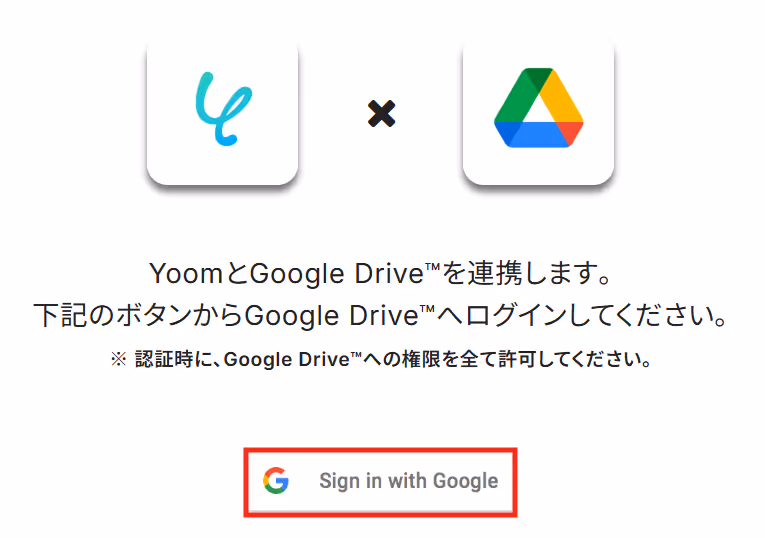 Google Driveを選択すると下記の画面が表示されるので、「Sign in with Google」をクリックします。