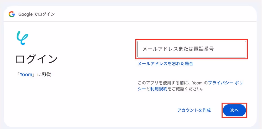 メールアドレスまたは電話番号を入力し、「次へ」をクリックします。