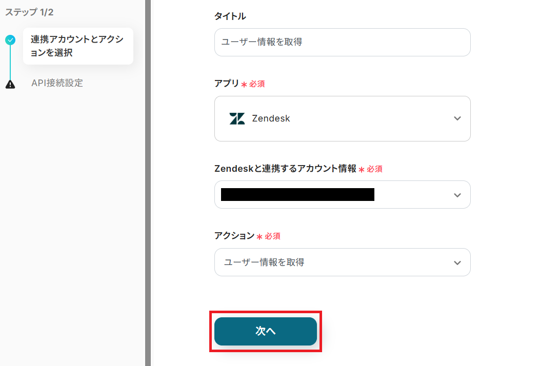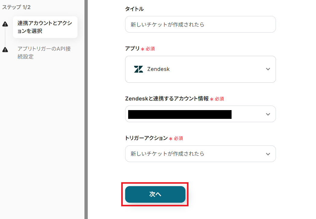 タイトルを任意で設定し、Zendeskと連携するアカウントやアクション内容を確認したら「次へ」を押してください。