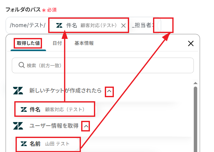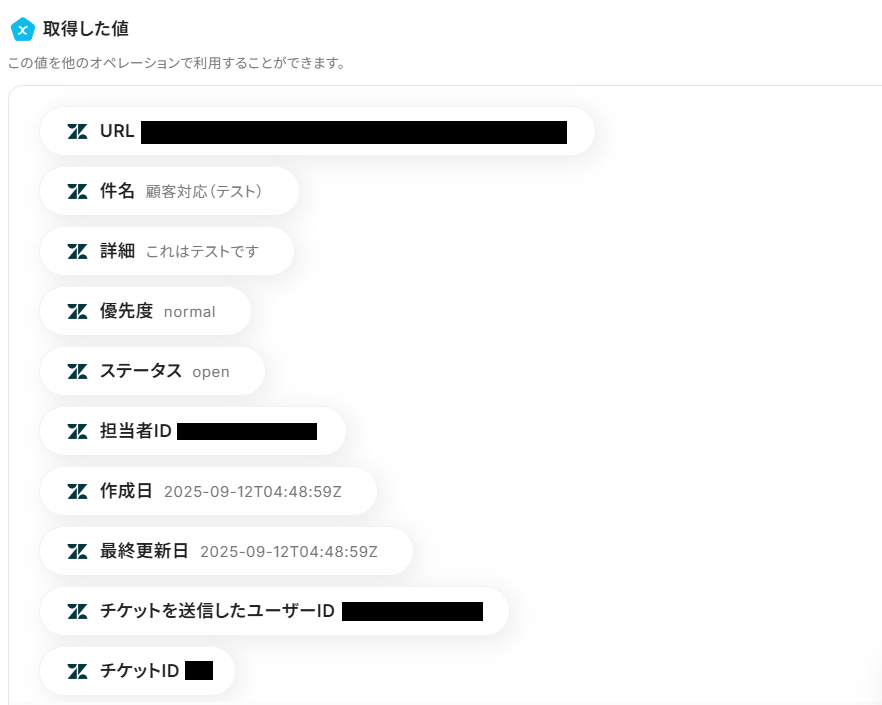 「取得した値」として、Zendeskに作成したチケットの情報が反映されていれば成功です!