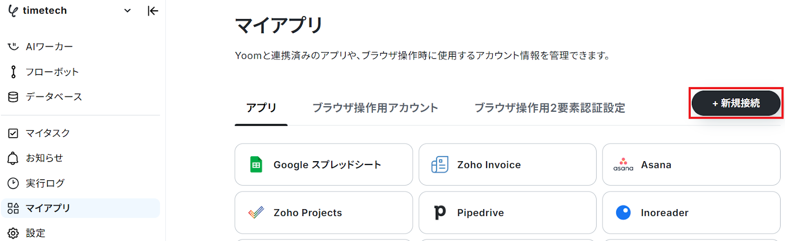 Yoomのマイアプリ連携画面を開いたら「新規接続」ボタンを押します。
