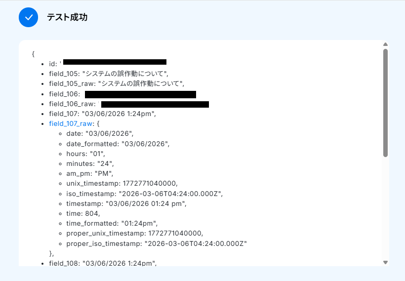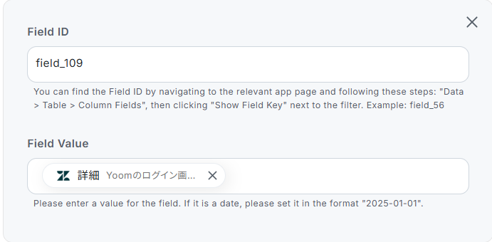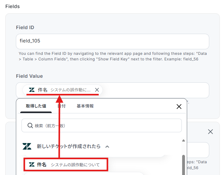 設定したい項目に合わせてField IDを入力してください。(field_105等) Field Valueには、ステップ4で取得した値の「件名」が自動で取得できるように設定されています。※取得した値を利用することで、トリガーが起動するたびに最新の値を自動で引用できます。
