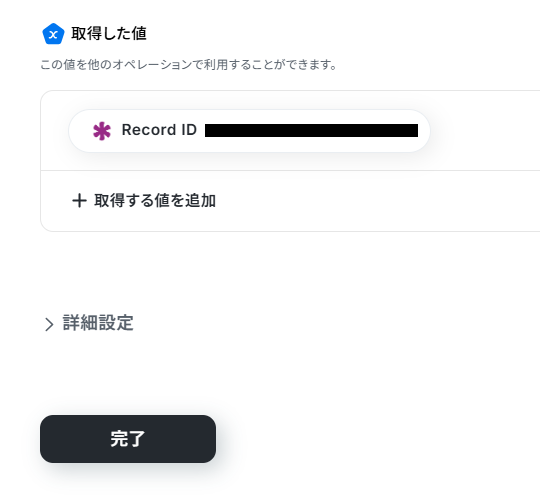 テストが成功すると、Zendeskに作成したチケットのデータが取得した値に反映されます。 確認できたら「完了」ボタンを押しましょう。 ※取得した値 とは、トリガーやオペレーション設定時に、テストを実行し取得した値です。 後続のオペレーション設定時の値として利用でき、フローボットを起動する度に変動した値 として引用できます。参照: テストの重要性「取得した値」のテスト値について