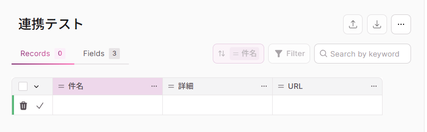 ≪事前準備≫ Knackに今回の自動化に使用するテーブルを準備しておきましょう。(既に使用しているテーブルを使用することも可能です。) 今回は、Zendeskのチケットデータをまとめたいため、例として以下の内容で作成しました。