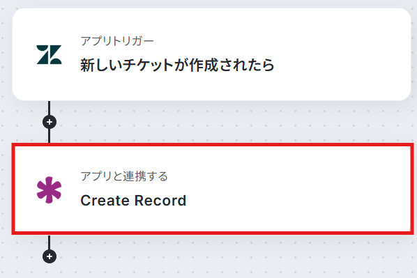 ステップ4:Knackに新しくレコードを作成するアクションの設定 次に、先ほど取得したZendeskのチケットデータを引用し、Knackのレコードを自動作成する設定を行いましょう。 「Create Record」という項目を選択します。