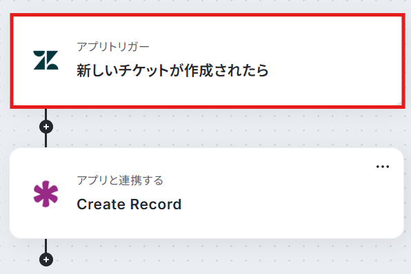 はじめに、ZendeskとKnackをYoomと連携します。 次に、トリガーでZendeskを選択し、「新しいチケットが作成されたら」というアクションを設定します。 最後に、オペレーションでKnackの「Create Record」アクションを設定し、トリガーで取得したチケット情報を連携します。 ※「トリガー」:フロー起動のきっかけとなるアクション、「オペレーション」:トリガー起動後、フロー内で処理を行うアクション■このワークフローのカスタムポイント