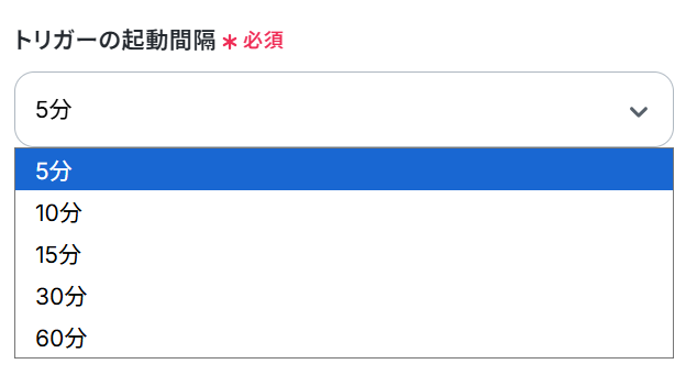 トリガーの起動タイミングは、5分、10分、15分、30分、60分のいずれかで設定できます。ご利用プラン によって、設定できるトリガーの最短間隔が違うので、その点は要チェックです。 なお、基本的にはそのプランの最短の起動間隔にしてお使いいただくことをおすすめします。