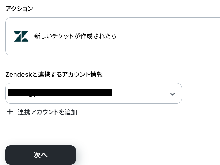 Zendeskと連携するアカウント情報が、正しく設定されているのを確認し「次へ」ボタンをクリックします。