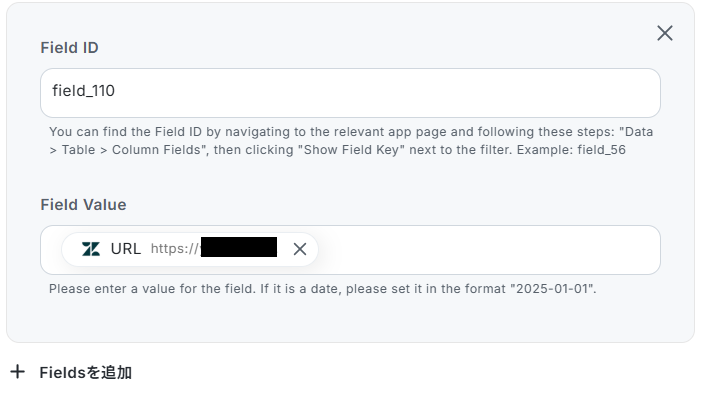 Zendeskチケットの「詳細」「URL」も同様に設定されています。 ※不要なFieldsは、各項目の右上にある✕印で消去できます。 また、追加したい場合は「+Fieldsを追加」ボタンをクリックし設定しましょう。