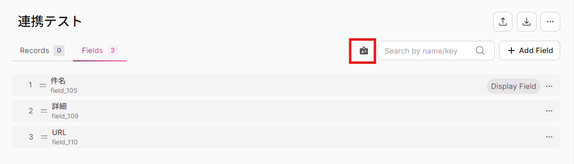 各Fieldの設定をおこないます。 事前準備で作成したテーブルの「Fields」をクリックし、下記画像の赤枠で囲ってあるマークを押すとField IDが表示されます。