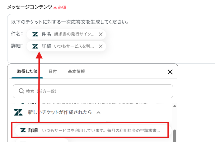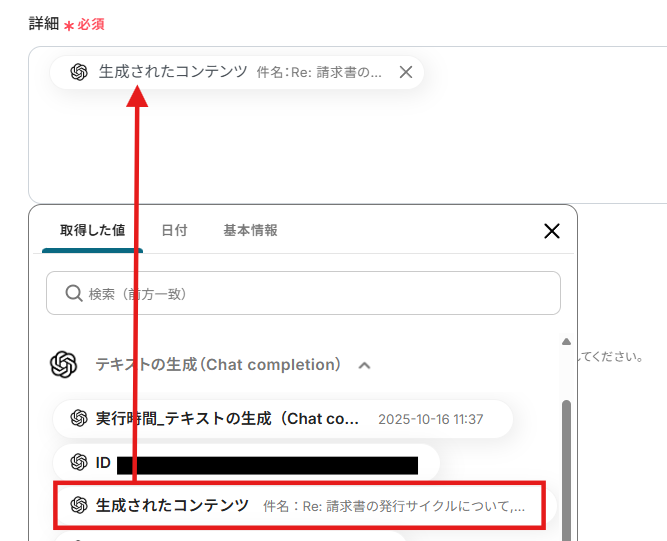 詳細にはOpenAIで生成した回答を取得した値から選択し入力します。