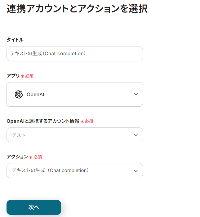 連携アカウントとアクションを選択する画面が表示されるので、今回連携するOpenAIのアカウントを確認し「次へ」をクリックします。