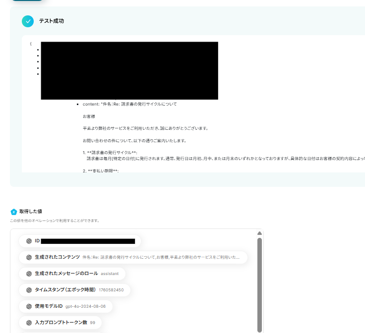 「テスト」をクリックし、実際にOpenAIで回答が生成できているかを確認します。