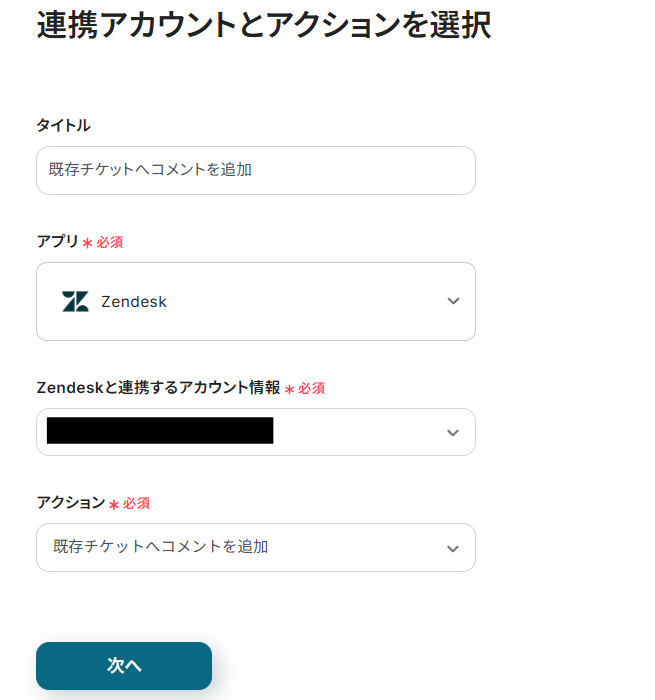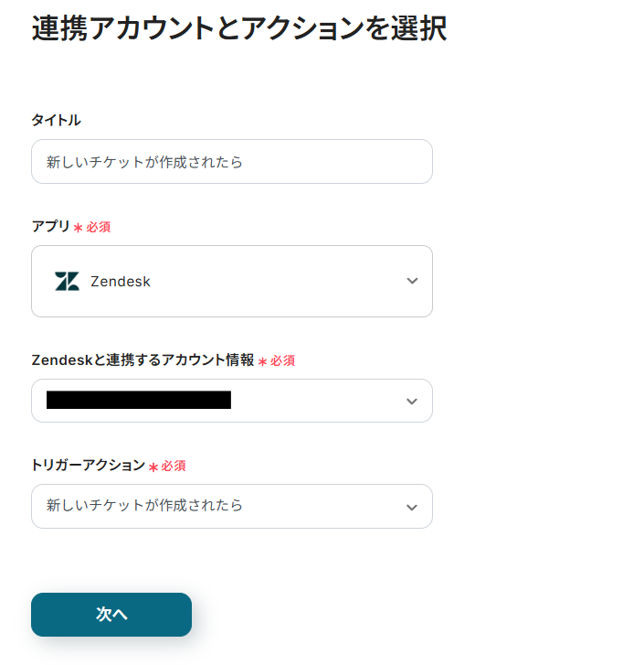 連携アカウントとアクションを選択する画面が表示されるので、今回連携するZendeskのアカウントを確認し「次へ」をクリックします。