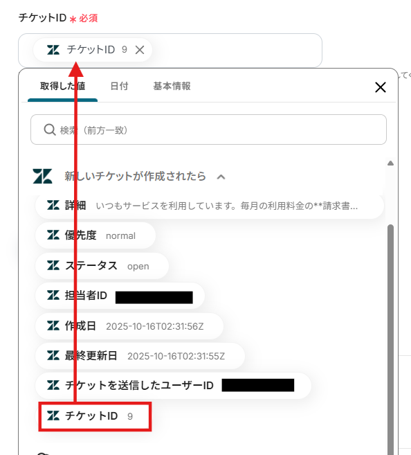 メッセージコンテンツには以下のようにZendeskから取得した値を用いて「件名」「詳細」を入力しました。