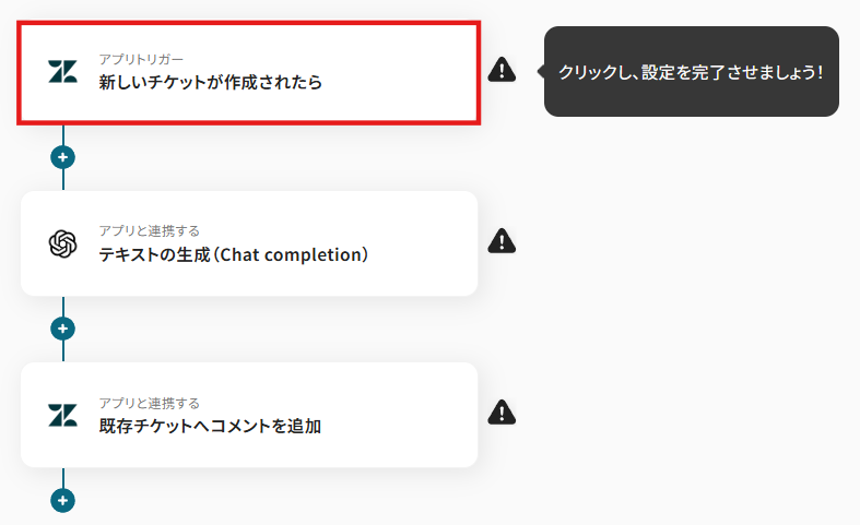 このワークフローを活用すれば、ZendeskとOpenAIを連携させ、新しいチケットが作成された際に自動で応答文を生成し返信までを行えるため、こうした課題をスムーズに解消できます。