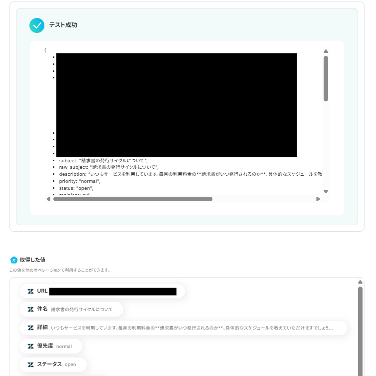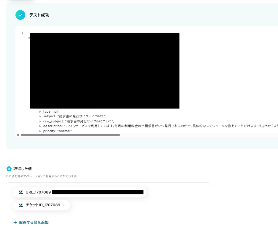 実際にZendeskでチケットを作成し、Yoomで「テスト」をクリック。