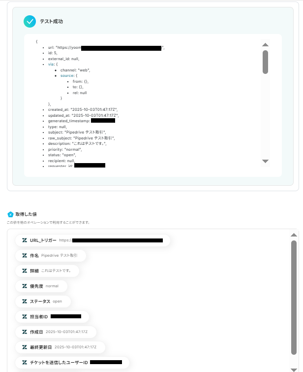 ここで取得した値を活用することにより、今後新たにZendeskでチケットが作成される度に、新しい内容がPipedriveに連携されていきます。