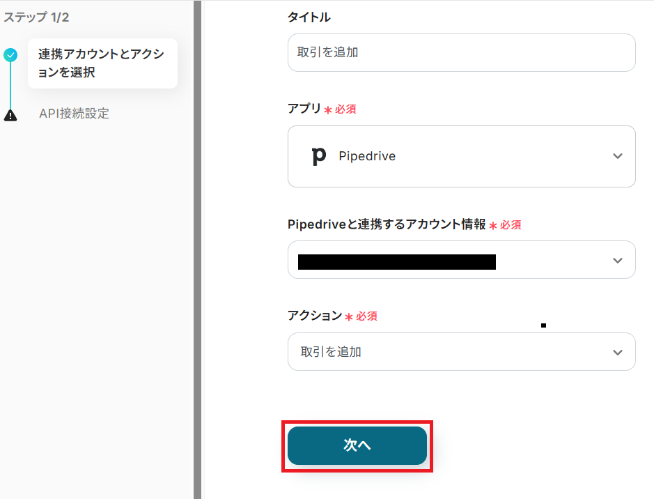 タイトルを任意で設定し、Pipedriveと連携するアカウントやアクション内容を確認したら「次へ」を押してください。