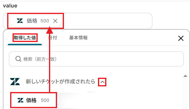 この例では、Zendeskのカスタムフィールドの「価格」を取得した値から「Value」に追加できますね。
