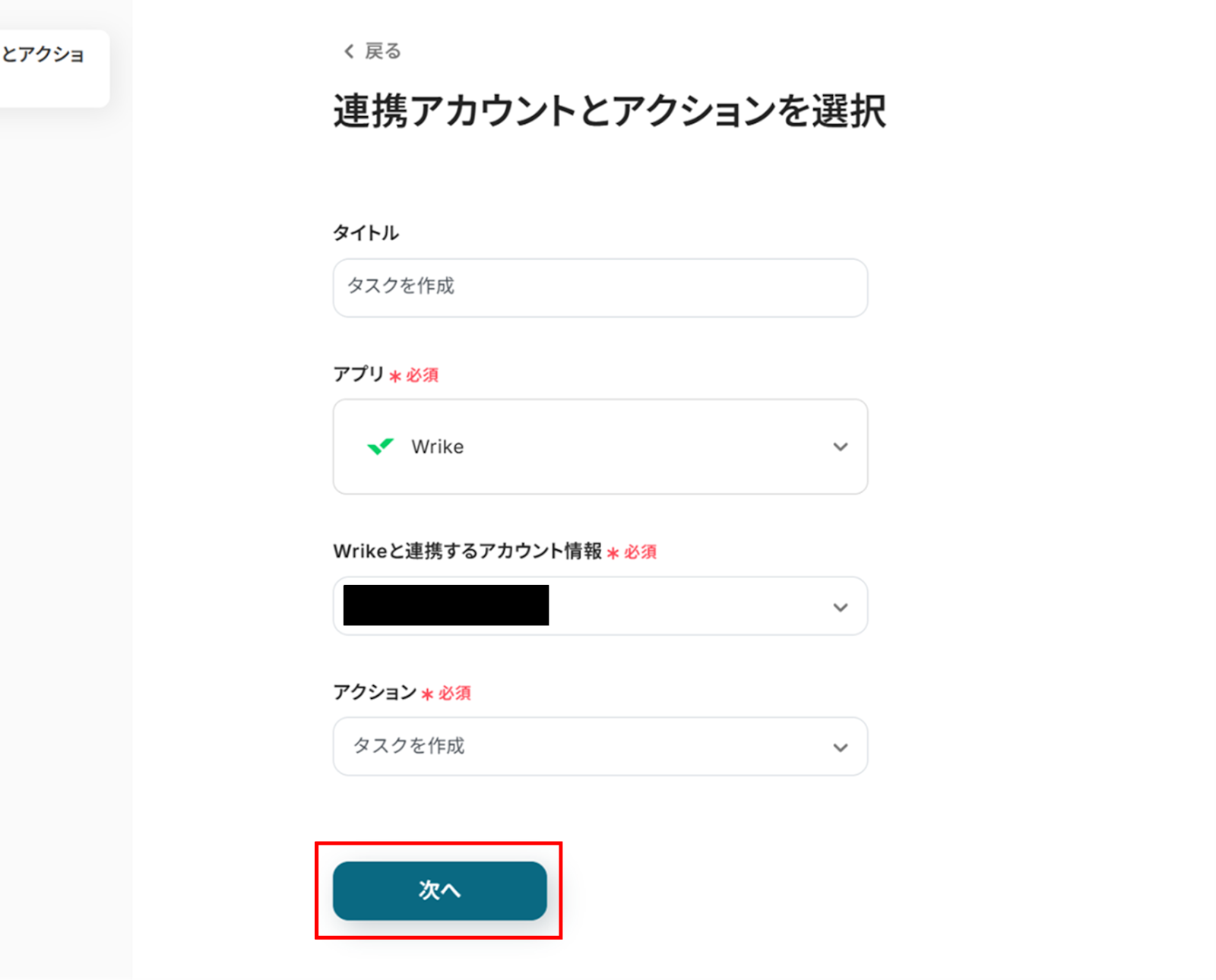 (2)「連携アカウントとアクションを選択」画面から、Wrikeと連携するアカウント情報に誤りがないかを確認し、アクションは「タスクを作成」のままで「次へ」をクリックします。