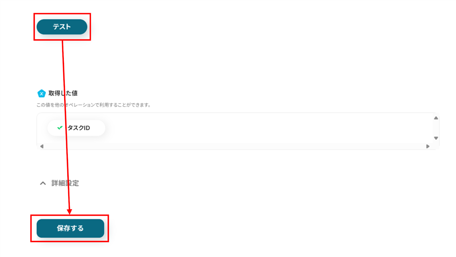 入力が完了したら「テスト」をクリックし、Wrikeにタスクが作成されていれば「保存する」をクリックします。