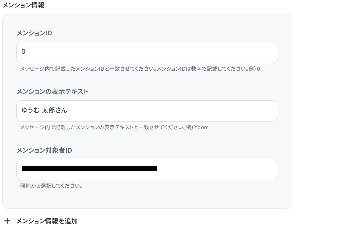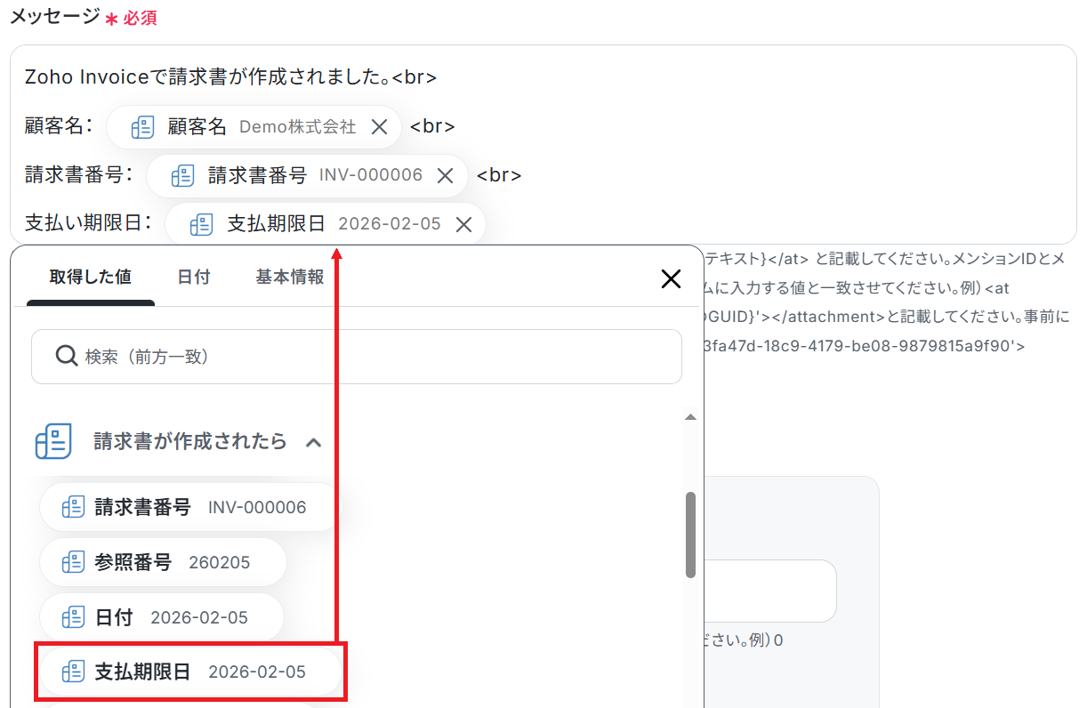 続けて、メッセージ を入力しましょう。Zoho Invoiceから取得した値や、固定のテキストを組み合わせて自由にカスタマイズ可能です。 以下のように取得した値を設定することで、トリガーが実行されるたびに最新の請求書情報が反映されます。