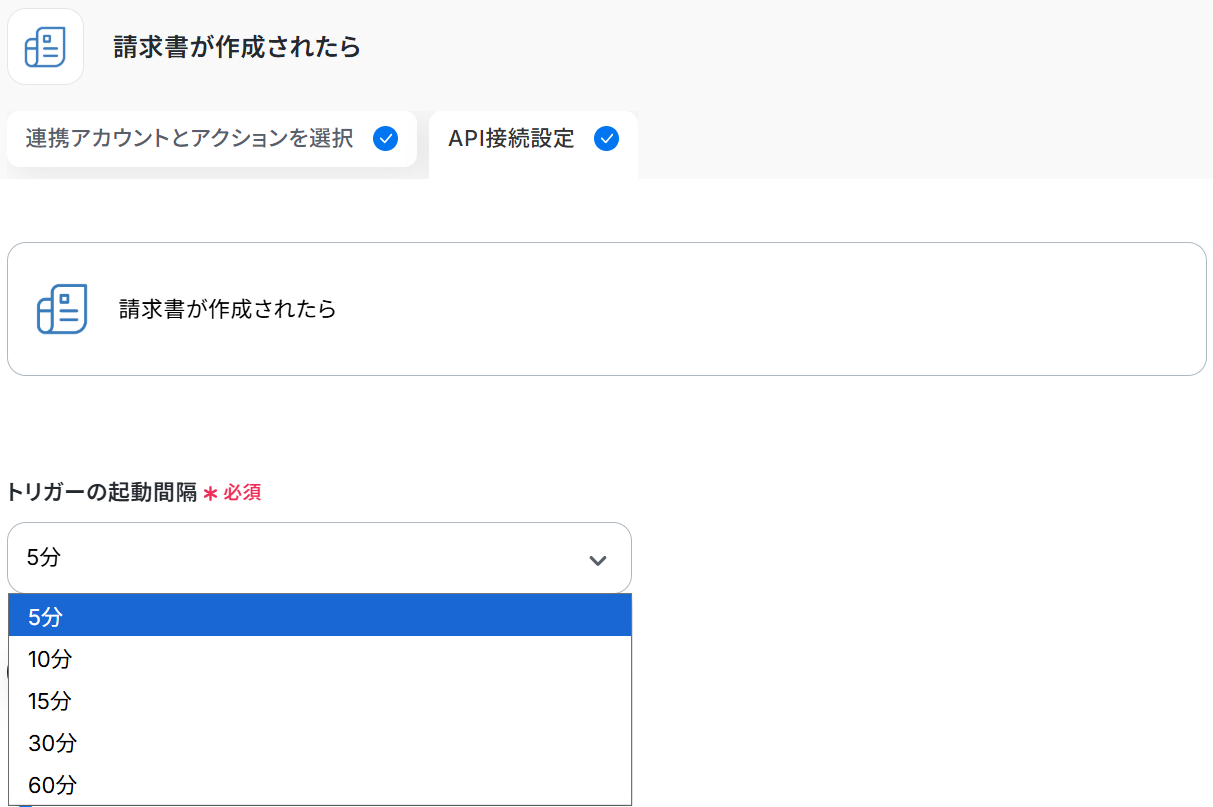 Zoho InvoiceとGoogle スプレッドシートのそれぞれとYoomを連携してください。 トリガーは5分、10分、15分、30分、60分の間隔で起動間隔を選択できます。 プランによって最短の起動間隔が異なりますので、ご注意ください。