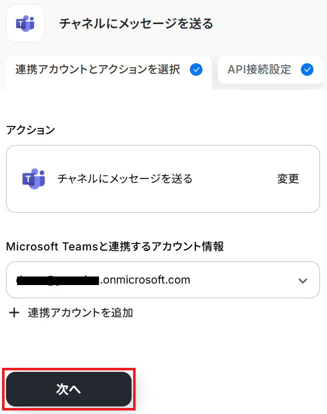 ステップ3と同様、アクションは「チャネルにメッセージを送る」のまま「次へ」をクリックします。