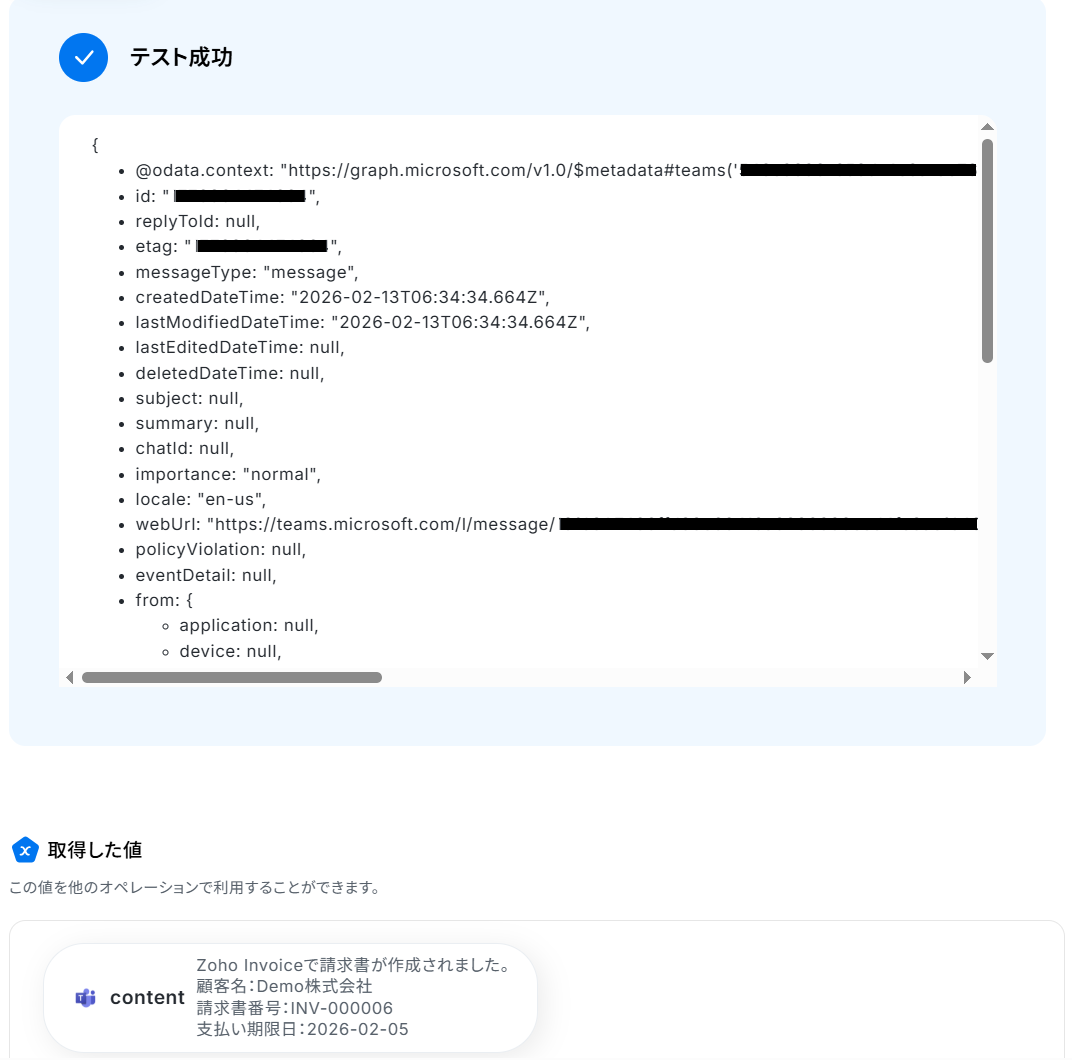 Microsoft Teamsの「チャネルにメッセージを送る」アクションでは、通知を送りたいチームIDとチャネルIDを任意で設定してください 通知するメッセージの本文も自由にカスタマイズが可能です。Zoho Invoiceのトリガーから取得した請求書番号や顧客名などの情報を含めることで、より具体的な通知を作成できます ■注意事項
